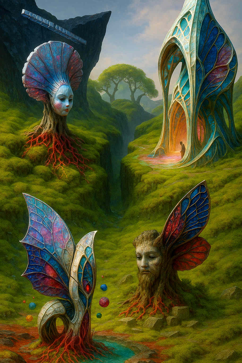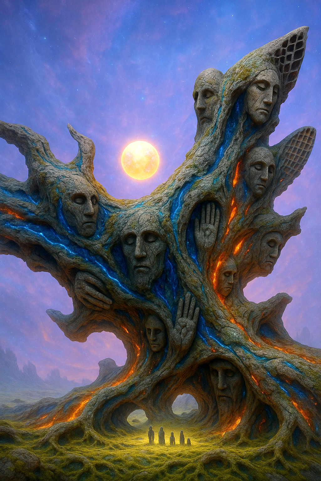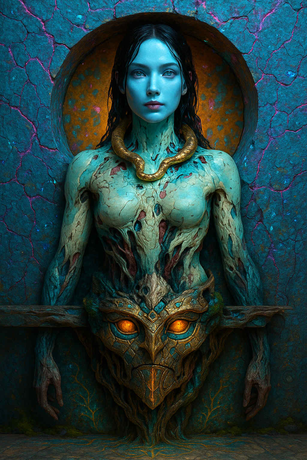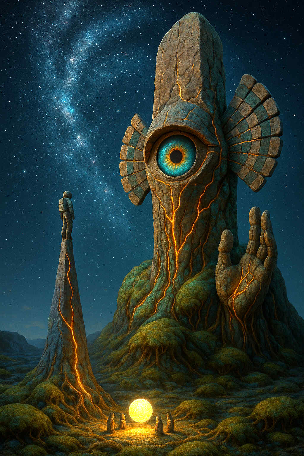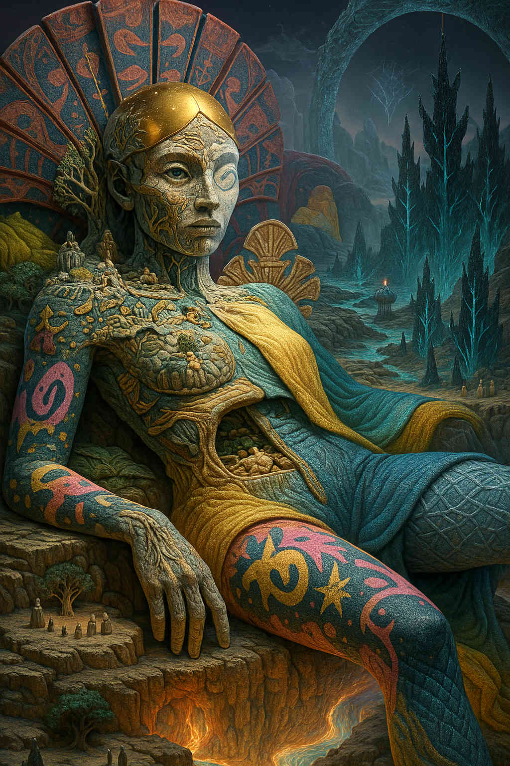Diese Galerie zeigt eine Bildwelt, die sich jenseits bekannter Kategorien bewegt: monumentale Hybridwesen, geformt aus Stein, Wurzeln, Licht und organisch verschlungenen Strukturen. Ihre Körper wirken zugleich wie Landschaften, Skulpturen und mythische Archetypen, getragen von einer eigenen Symbolsprache aus Masken, Händen, Schachmustern und leuchtenden Energieadern. Viele der Figuren scheinen nicht gebaut, sondern gewachsen – wie Relikte einer fremden Zivilisation, die Natur und Bewusstsein miteinander verschmilzt. Die Werke formen eine kohärente Welt, in der Biologie, Mythologie und Architektur nahtlos ineinander übergehen. In ihrer Konsequenz und Wiedererkennbarkeit entfalten sie eine ungewöhnlich starke visuelle Identität: eine organische Mythopoetik, die zugleich poetisch, rätselhaft und zeitlos wirkt.