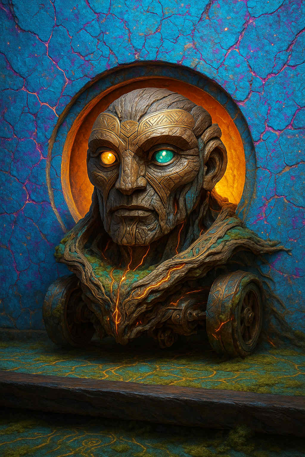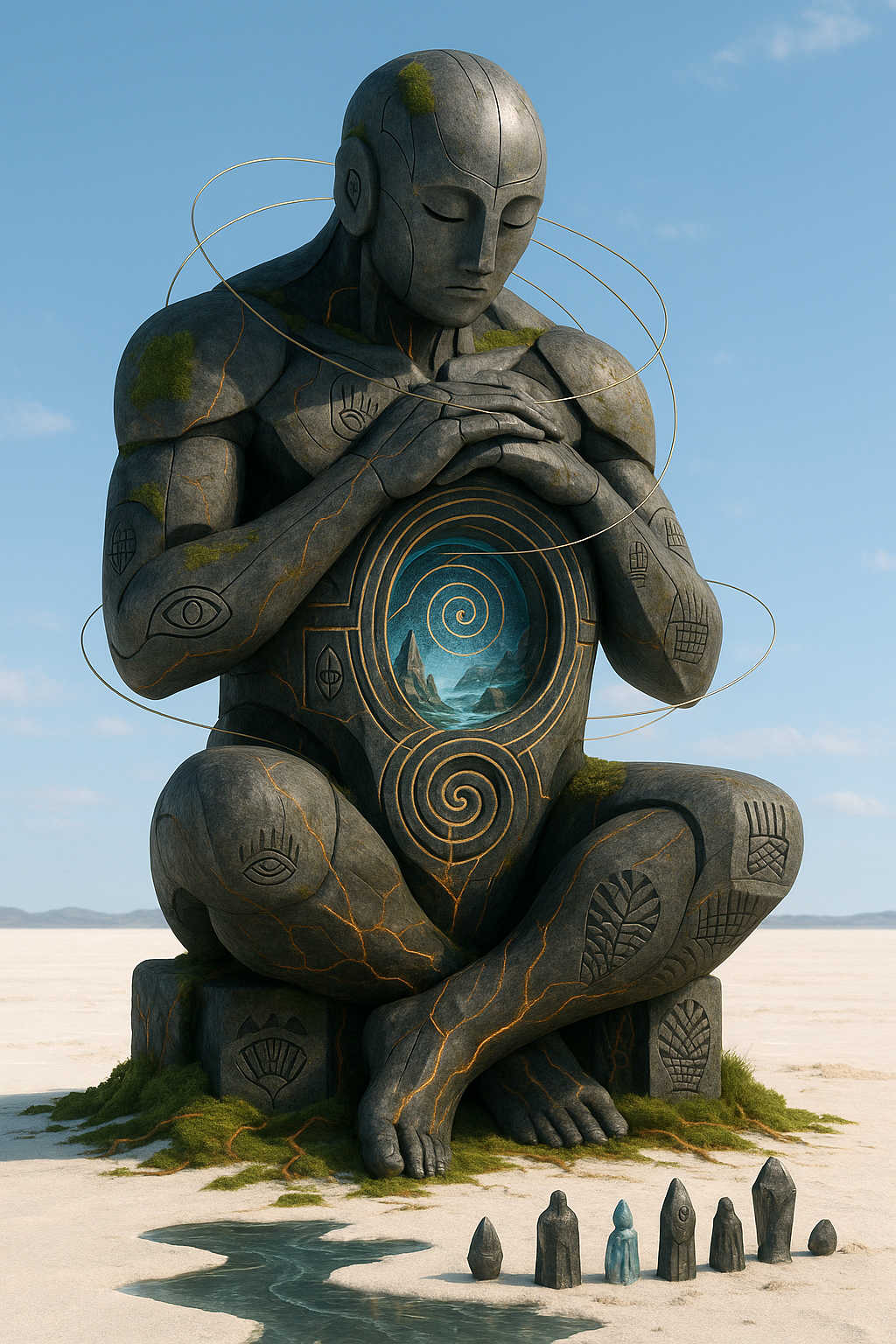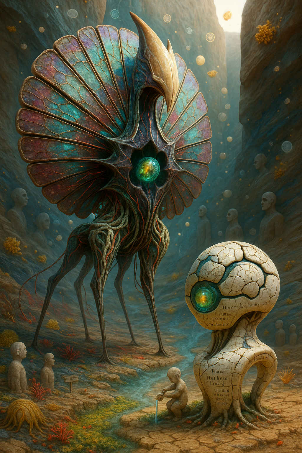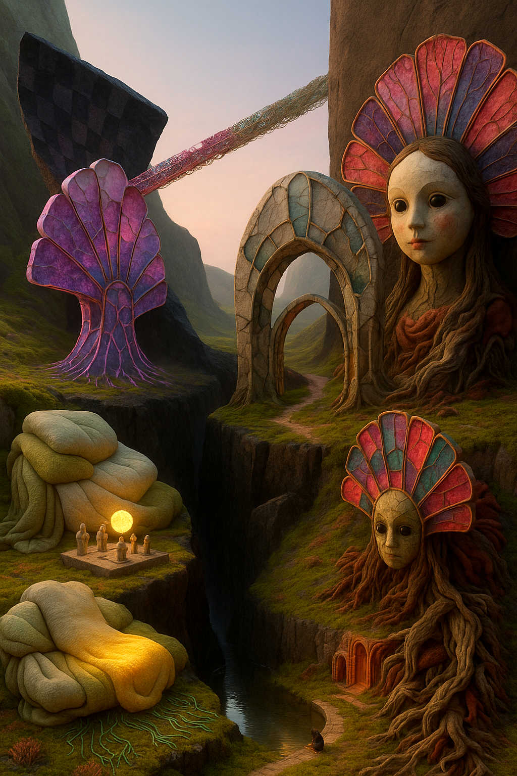Diese Galerie zeigt eine Bildwelt, die sich jenseits bekannter Kategorien bewegt: monumentale Hybridwesen, geformt aus Stein, Wurzeln, Licht und organisch verschlungenen Strukturen. Ihre Körper wirken zugleich wie Landschaften, Skulpturen und mythische Archetypen, getragen von einer eigenen Symbolsprache aus Masken, Händen, Schachmustern und leuchtenden Energieadern. Viele der Figuren scheinen nicht gebaut, sondern gewachsen – wie Relikte einer fremden Zivilisation, die Natur und Bewusstsein miteinander verschmilzt. Die Werke formen eine kohärente Welt, in der Biologie, Mythologie und Architektur nahtlos ineinander übergehen. In ihrer Konsequenz und Wiedererkennbarkeit entfalten sie eine ungewöhnlich starke visuelle Identität: eine organische Mythopoetik, die zugleich poetisch, rätselhaft und zeitlos wirkt.