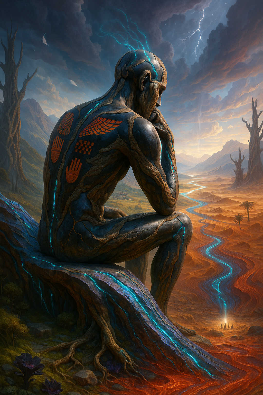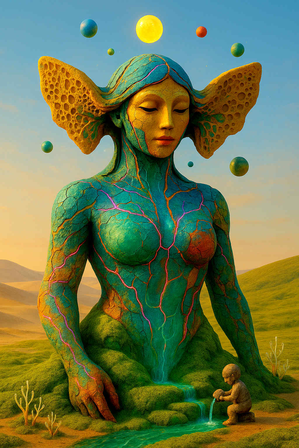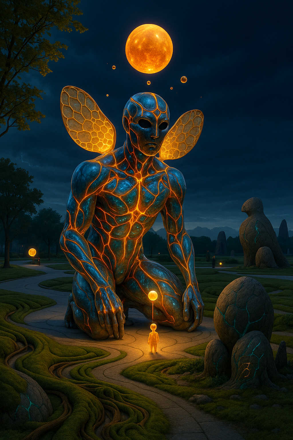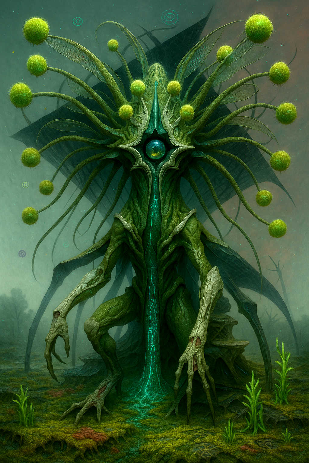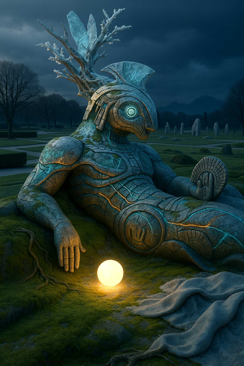 Diese Galerie zeigt eine Bildwelt, die sich jenseits bekannter Kategorien bewegt: monumentale Hybridwesen, geformt aus Stein, Wurzeln, Licht und organisch verschlungenen Strukturen. Ihre Körper wirken zugleich wie Landschaften, Skulpturen und mythische Archetypen, getragen von einer eigenen Symbolsprache aus Masken, Händen, Schachmustern und leuchtenden Energieadern. Viele der Figuren scheinen nicht gebaut, sondern gewachsen – wie Relikte einer fremden Zivilisation, die Natur und Bewusstsein miteinander verschmilzt. Die Werke formen eine kohärente Welt, in der Biologie, Mythologie und Architektur nahtlos ineinander übergehen. In ihrer Konsequenz und Wiedererkennbarkeit entfalten sie eine ungewöhnlich starke visuelle Identität: eine organische Mythopoetik, die zugleich poetisch, rätselhaft und zeitlos wirkt.
