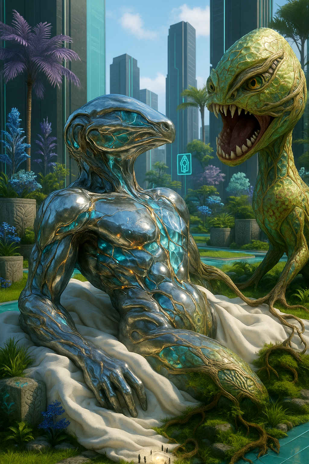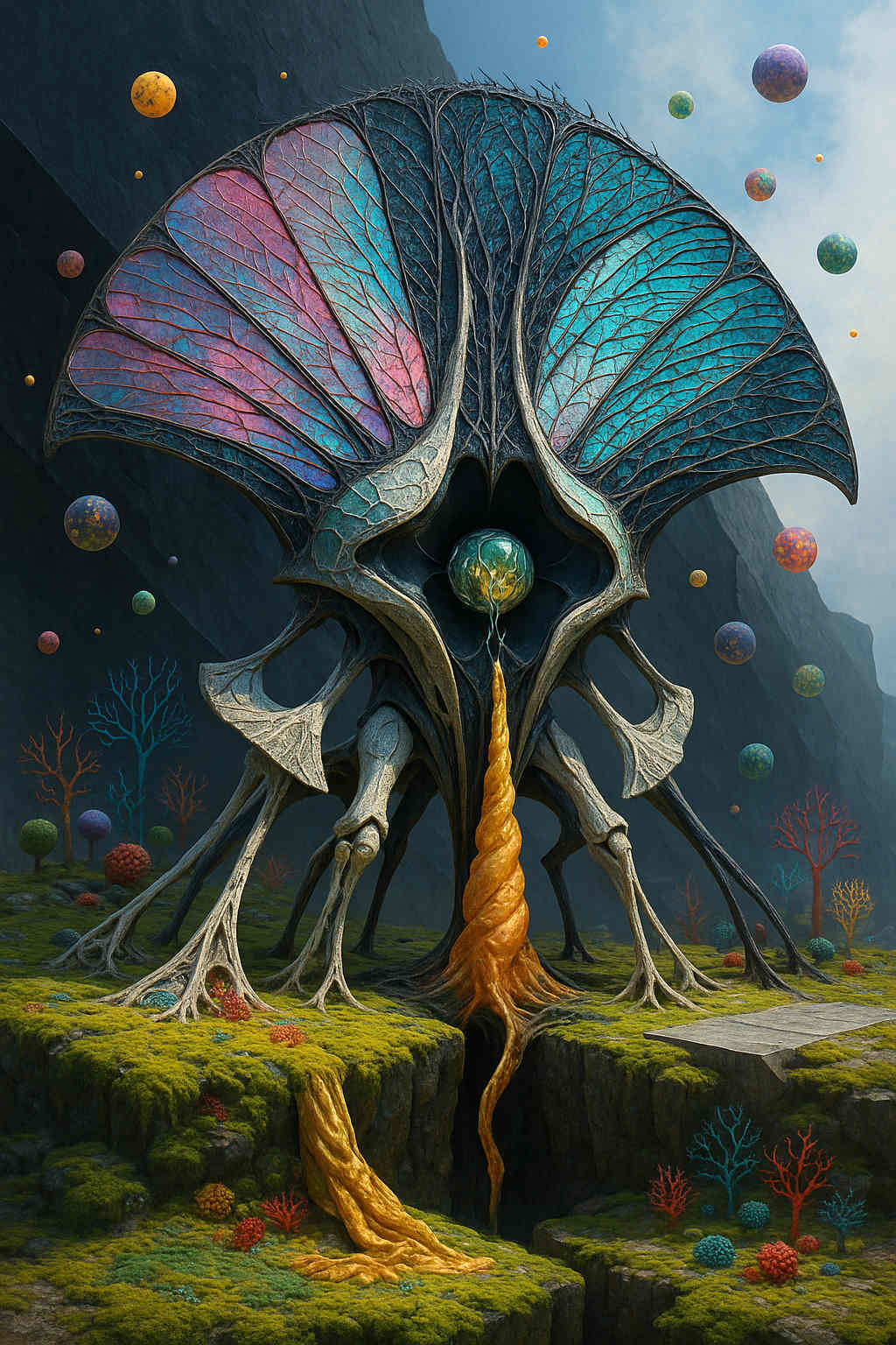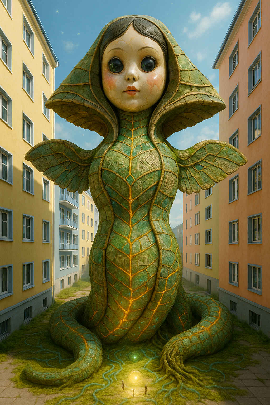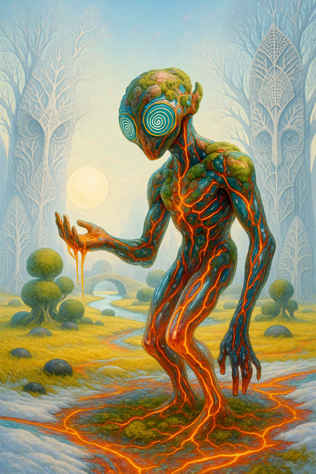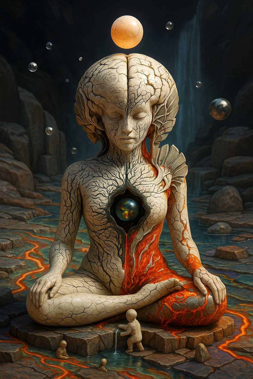 Diese Galerie zeigt eine Bildwelt, die sich jenseits bekannter Kategorien bewegt: monumentale Hybridwesen, geformt aus Stein, Wurzeln, Licht und organisch verschlungenen Strukturen. Ihre Körper wirken zugleich wie Landschaften, Skulpturen und mythische Archetypen, getragen von einer eigenen Symbolsprache aus Masken, Händen, Schachmustern und leuchtenden Energieadern. Viele der Figuren scheinen nicht gebaut, sondern gewachsen – wie Relikte einer fremden Zivilisation, die Natur und Bewusstsein miteinander verschmilzt. Die Werke formen eine kohärente Welt, in der Biologie, Mythologie und Architektur nahtlos ineinander übergehen. In ihrer Konsequenz und Wiedererkennbarkeit entfalten sie eine ungewöhnlich starke visuelle Identität: eine organische Mythopoetik, die zugleich poetisch, rätselhaft und zeitlos wirkt.