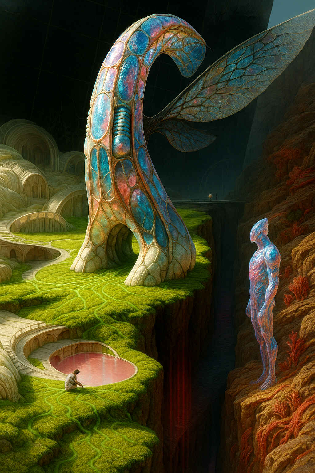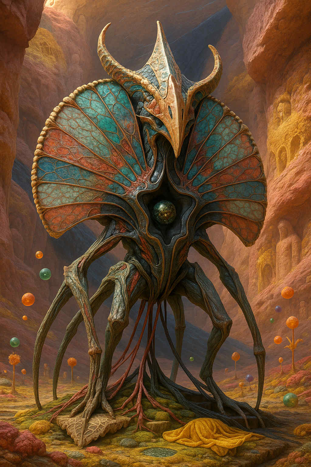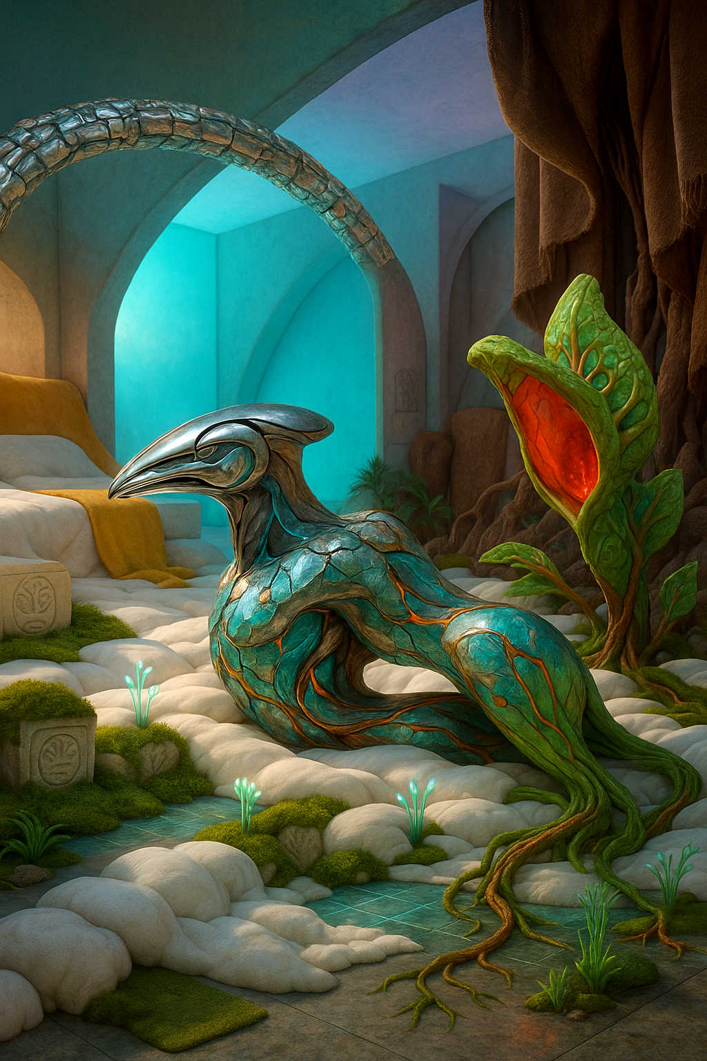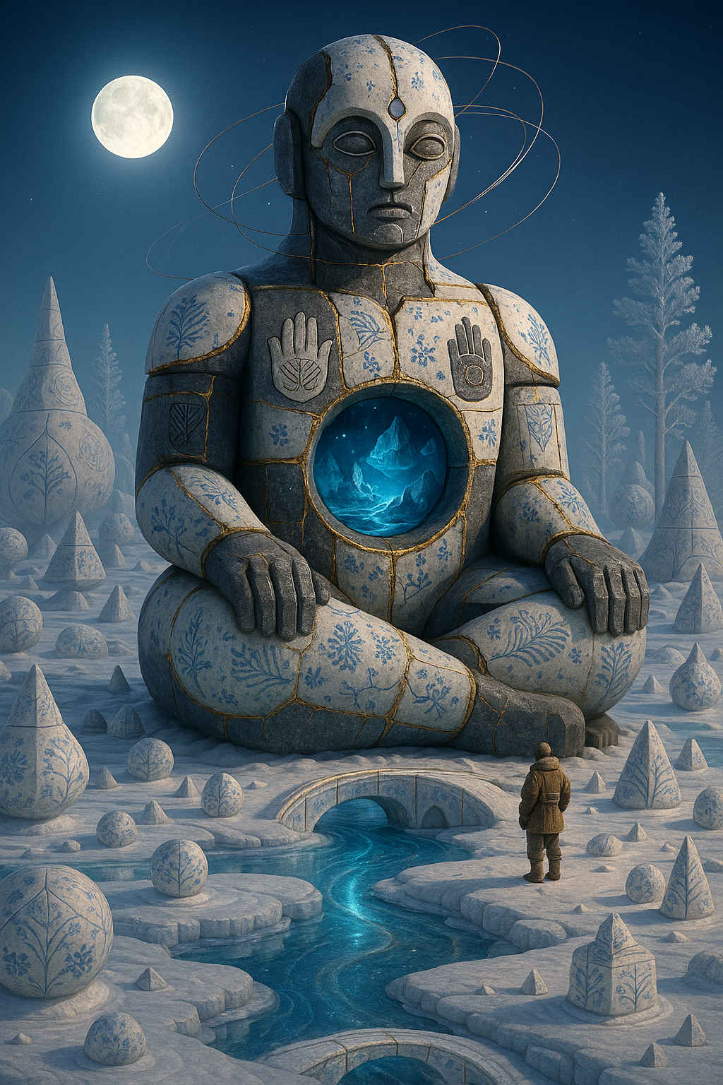 Diese Galerie zeigt eine Bildwelt, die sich jenseits bekannter Kategorien bewegt: monumentale Hybridwesen, geformt aus Stein, Wurzeln, Licht und organisch verschlungenen Strukturen. Ihre Körper wirken zugleich wie Landschaften, Skulpturen und mythische Archetypen, getragen von einer eigenen Symbolsprache aus Masken, Händen, Schachmustern und leuchtenden Energieadern. Viele der Figuren scheinen nicht gebaut, sondern gewachsen – wie Relikte einer fremden Zivilisation, die Natur und Bewusstsein miteinander verschmilzt. Die Werke formen eine kohärente Welt, in der Biologie, Mythologie und Architektur nahtlos ineinander übergehen. In ihrer Konsequenz und Wiedererkennbarkeit entfalten sie eine ungewöhnlich starke visuelle Identität: eine organische Mythopoetik, die zugleich poetisch, rätselhaft und zeitlos wirkt.