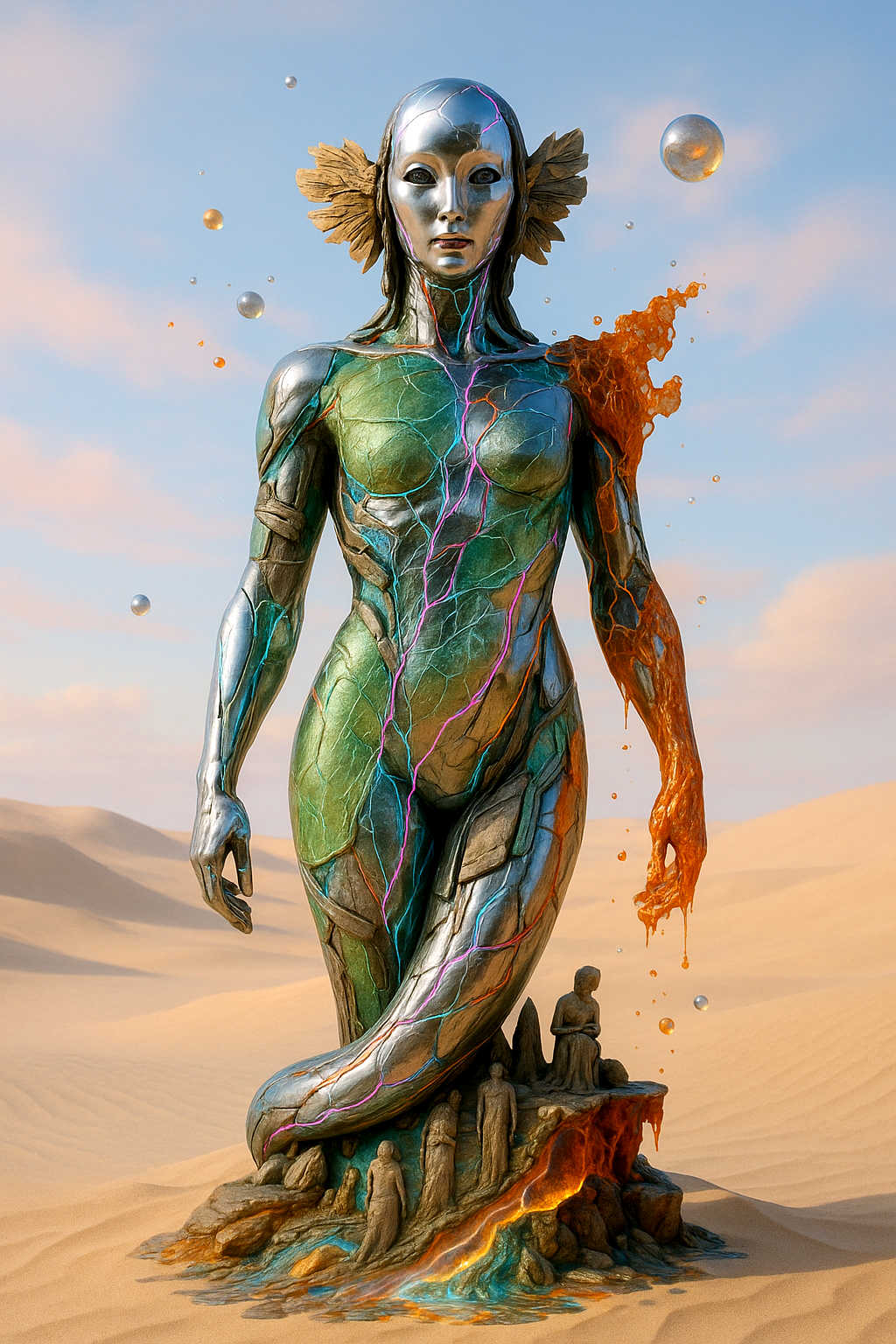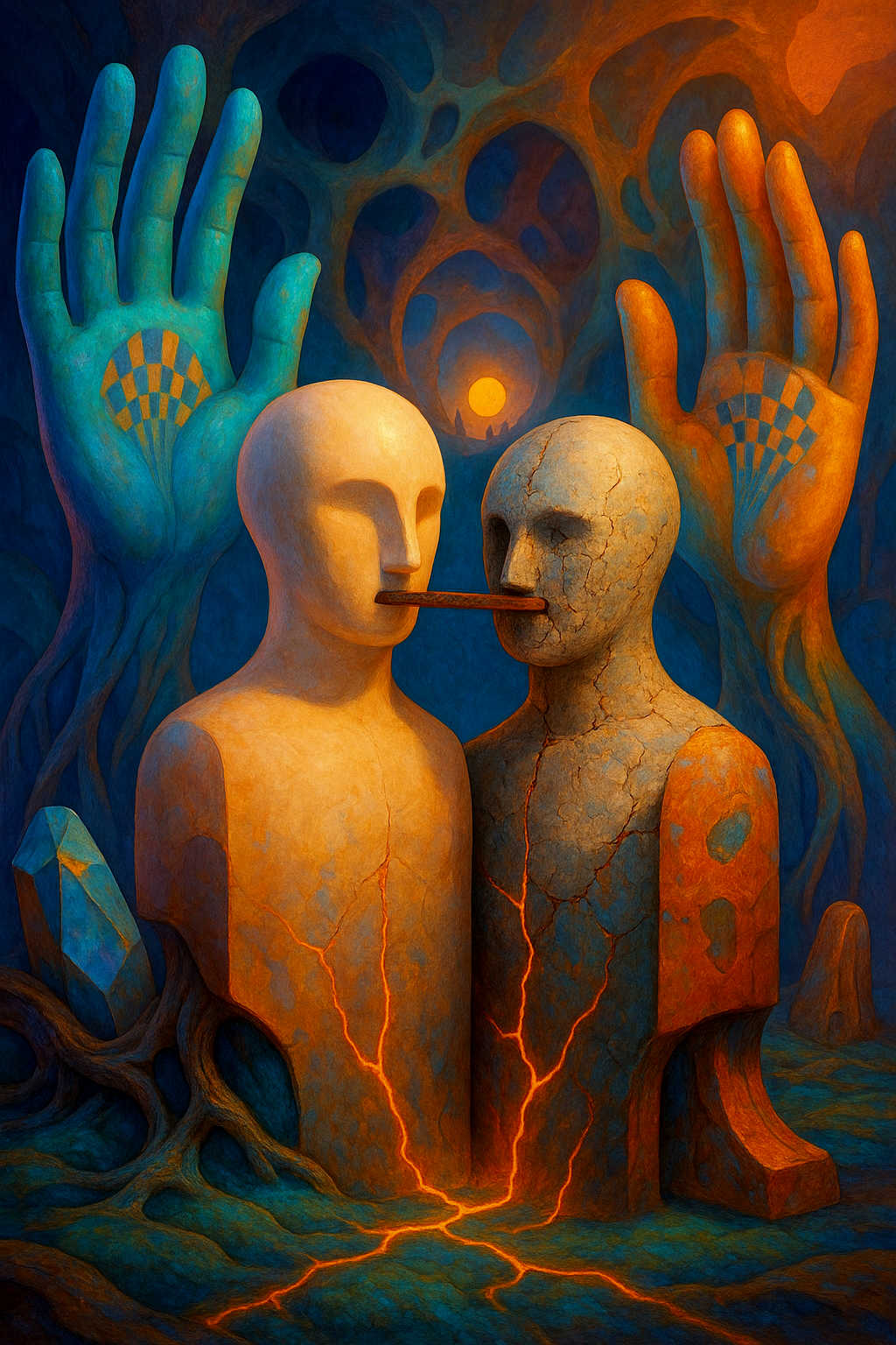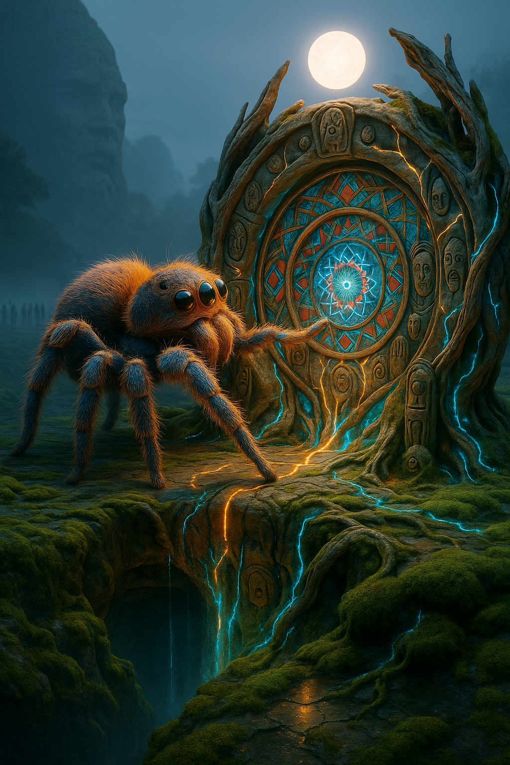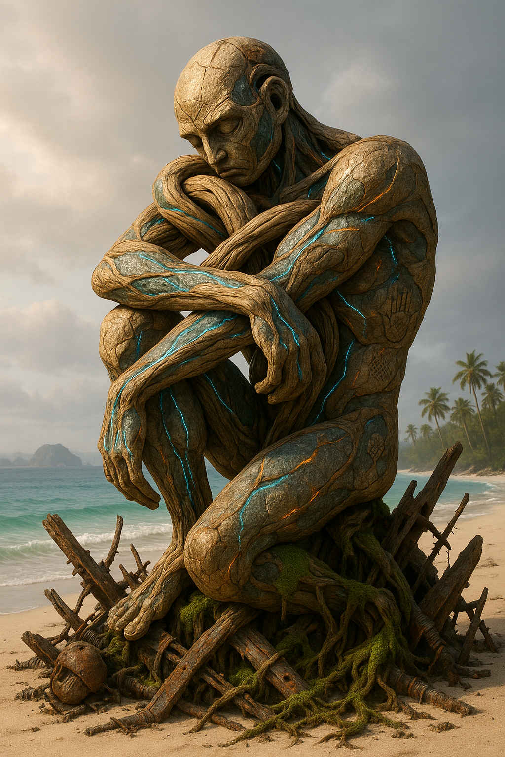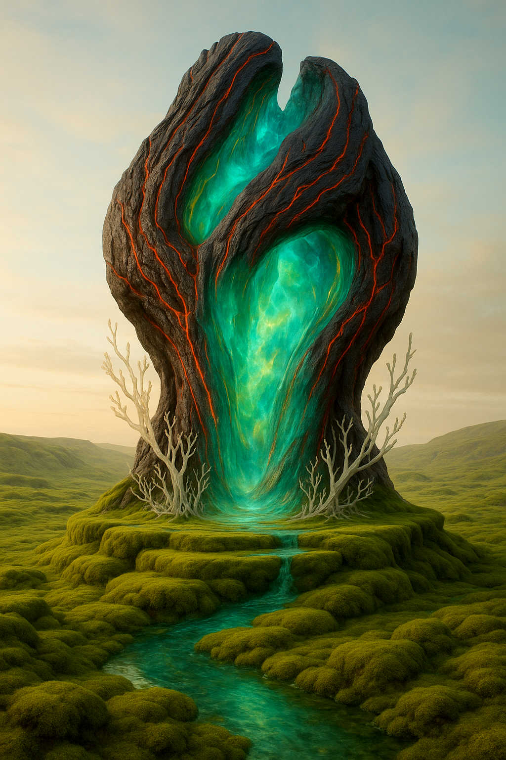 Diese Galerie zeigt eine Bildwelt, die sich jenseits bekannter Kategorien bewegt: monumentale Hybridwesen, geformt aus Stein, Wurzeln, Licht und organisch verschlungenen Strukturen. Ihre Körper wirken zugleich wie Landschaften, Skulpturen und mythische Archetypen, getragen von einer eigenen Symbolsprache aus Masken, Händen, Schachmustern und leuchtenden Energieadern. Viele der Figuren scheinen nicht gebaut, sondern gewachsen – wie Relikte einer fremden Zivilisation, die Natur und Bewusstsein miteinander verschmilzt. Die Werke formen eine kohärente Welt, in der Biologie, Mythologie und Architektur nahtlos ineinander übergehen. In ihrer Konsequenz und Wiedererkennbarkeit entfalten sie eine ungewöhnlich starke visuelle Identität: eine organische Mythopoetik, die zugleich poetisch, rätselhaft und zeitlos wirkt.