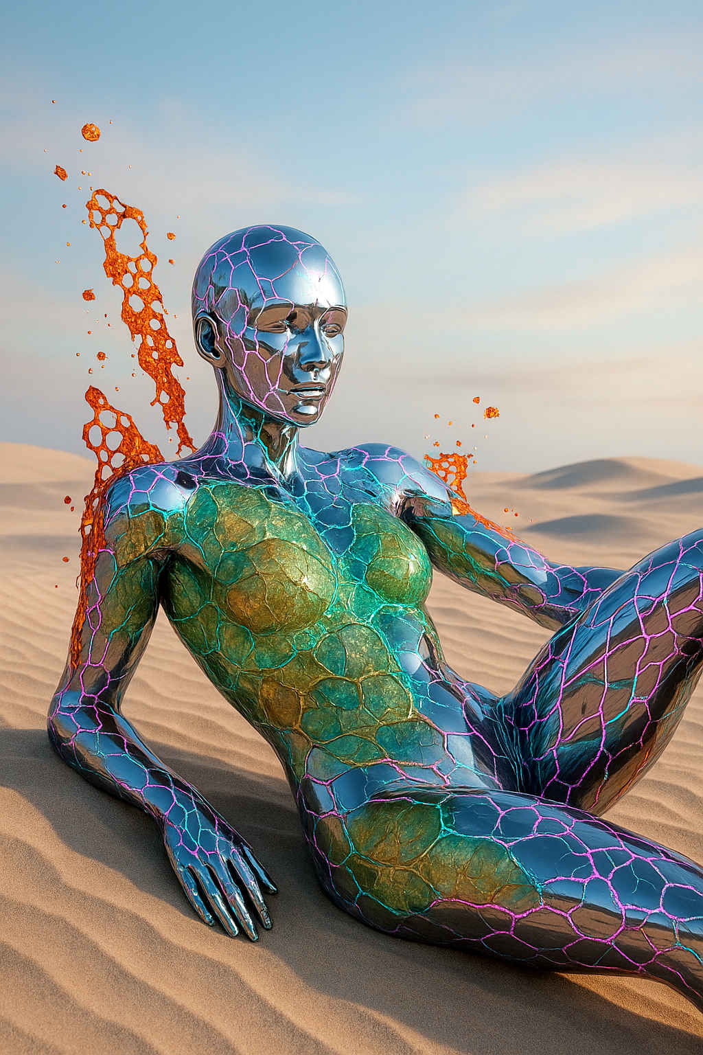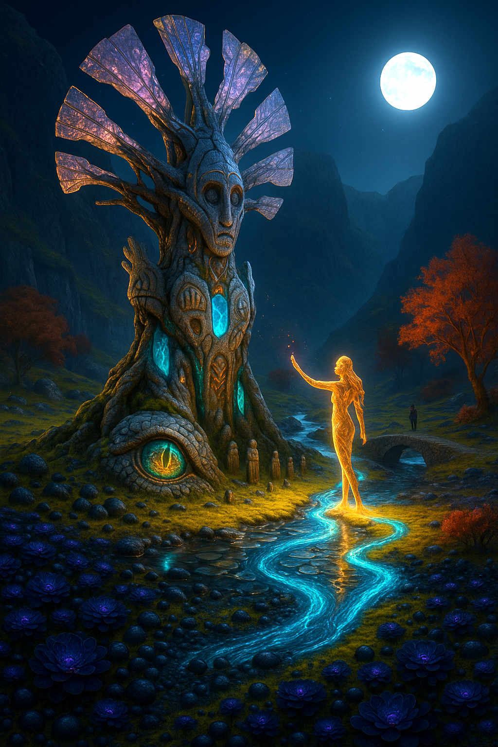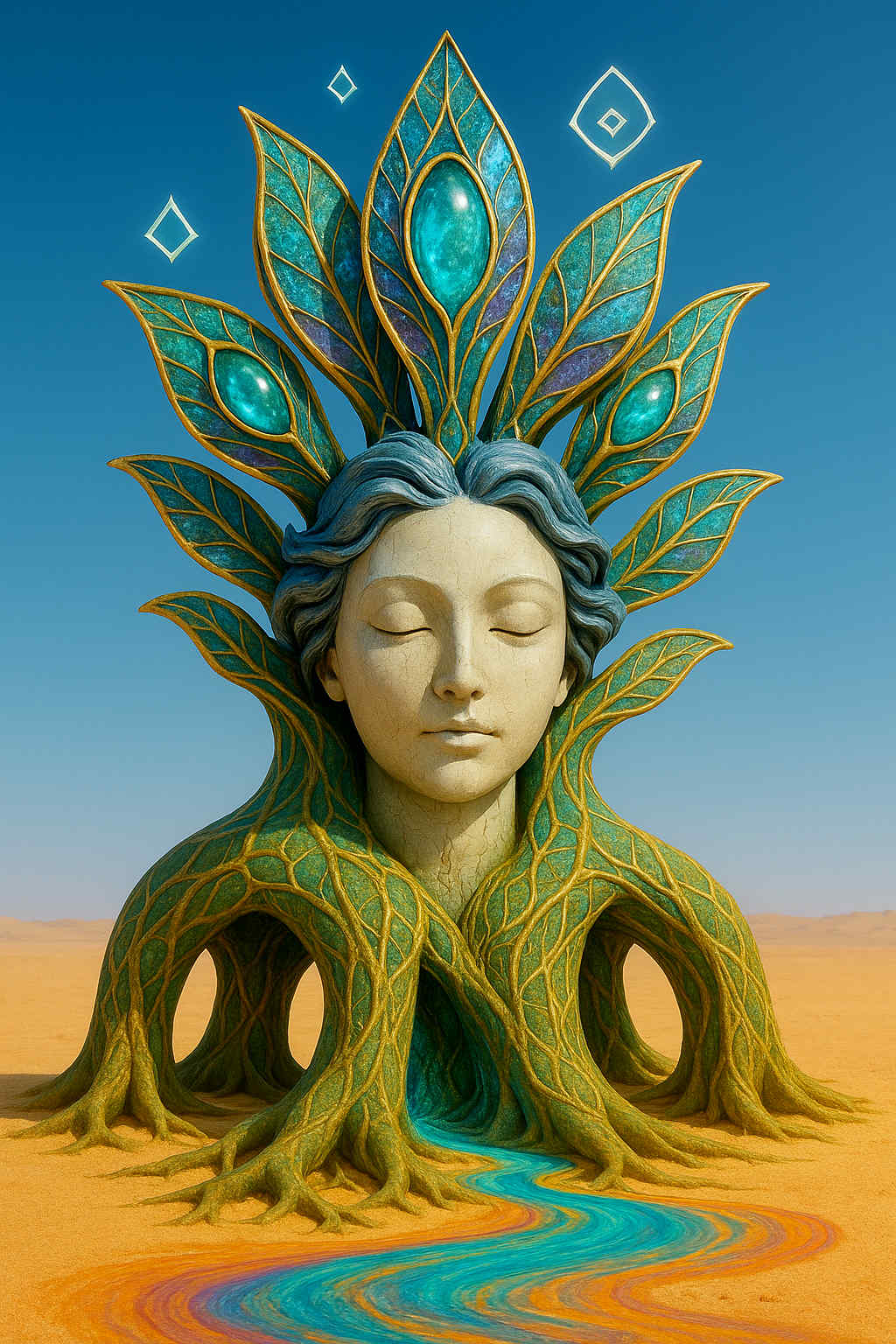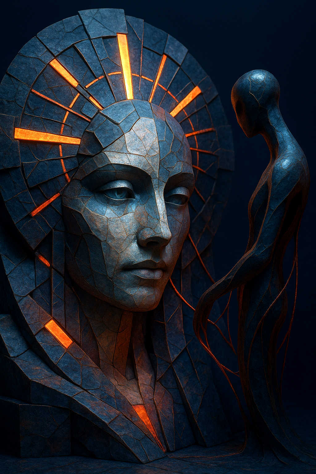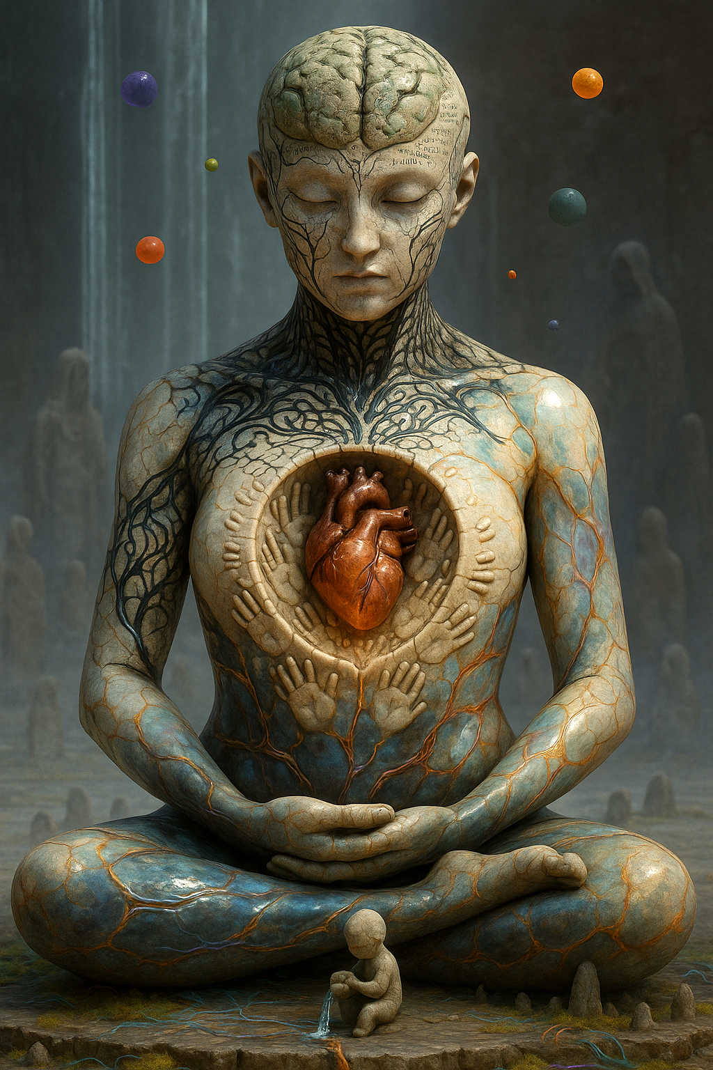 Diese Galerie zeigt eine Bildwelt, die sich jenseits bekannter Kategorien bewegt: monumentale Hybridwesen, geformt aus Stein, Wurzeln, Licht und organisch verschlungenen Strukturen. Ihre Körper wirken zugleich wie Landschaften, Skulpturen und mythische Archetypen, getragen von einer eigenen Symbolsprache aus Masken, Händen, Schachmustern und leuchtenden Energieadern. Viele der Figuren scheinen nicht gebaut, sondern gewachsen – wie Relikte einer fremden Zivilisation, die Natur und Bewusstsein miteinander verschmilzt. Die Werke formen eine kohärente Welt, in der Biologie, Mythologie und Architektur nahtlos ineinander übergehen. In ihrer Konsequenz und Wiedererkennbarkeit entfalten sie eine ungewöhnlich starke visuelle Identität: eine organische Mythopoetik, die zugleich poetisch, rätselhaft und zeitlos wirkt.