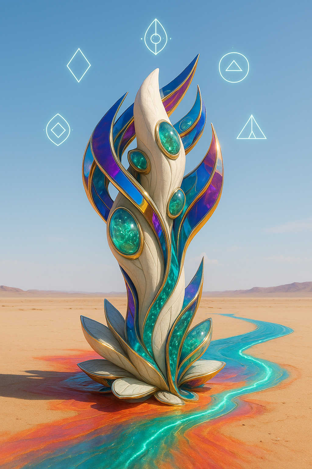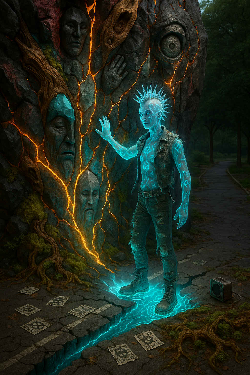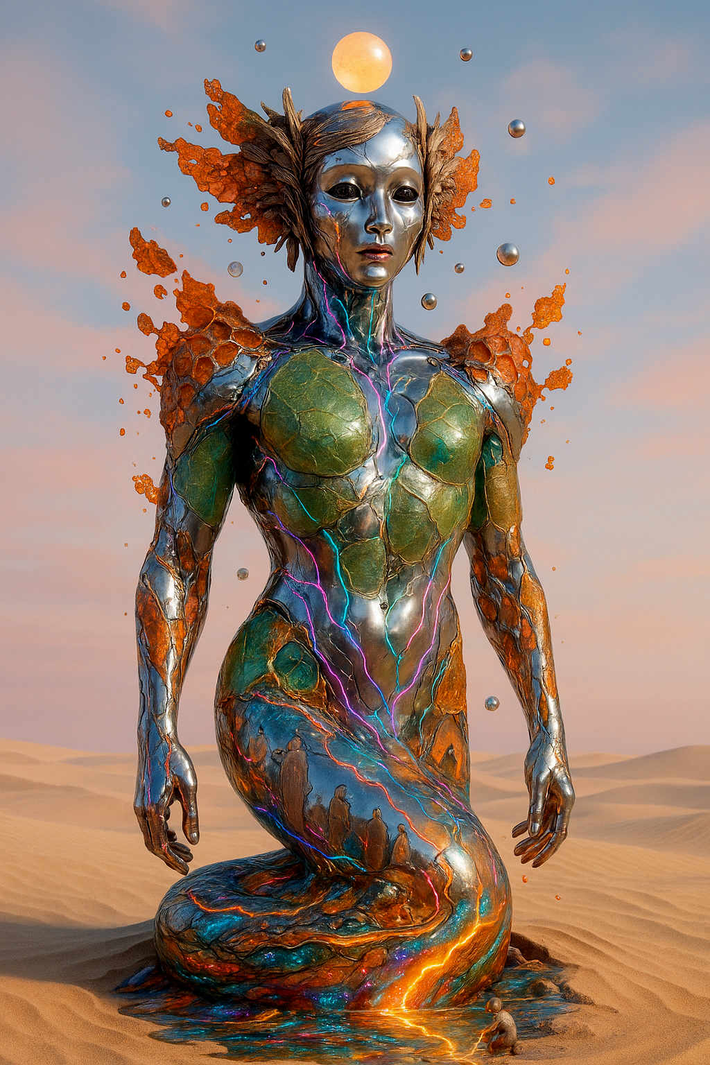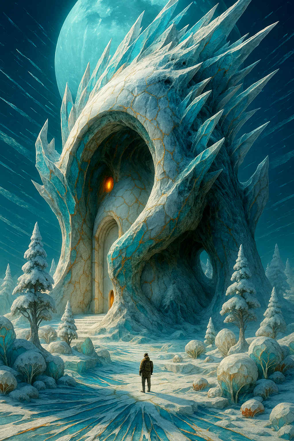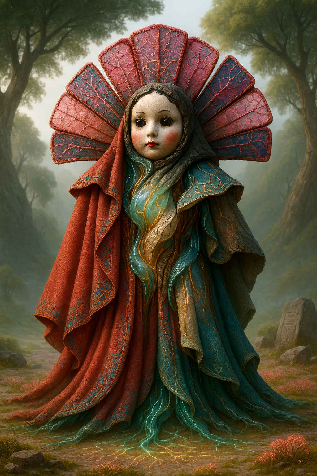 Diese Galerie zeigt eine Bildwelt, die sich jenseits bekannter Kategorien bewegt: monumentale Hybridwesen, geformt aus Stein, Wurzeln, Licht und organisch verschlungenen Strukturen. Ihre Körper wirken zugleich wie Landschaften, Skulpturen und mythische Archetypen, getragen von einer eigenen Symbolsprache aus Masken, Händen, Schachmustern und leuchtenden Energieadern. Viele der Figuren scheinen nicht gebaut, sondern gewachsen – wie Relikte einer fremden Zivilisation, die Natur und Bewusstsein miteinander verschmilzt. Die Werke formen eine kohärente Welt, in der Biologie, Mythologie und Architektur nahtlos ineinander übergehen. In ihrer Konsequenz und Wiedererkennbarkeit entfalten sie eine ungewöhnlich starke visuelle Identität: eine organische Mythopoetik, die zugleich poetisch, rätselhaft und zeitlos wirkt.