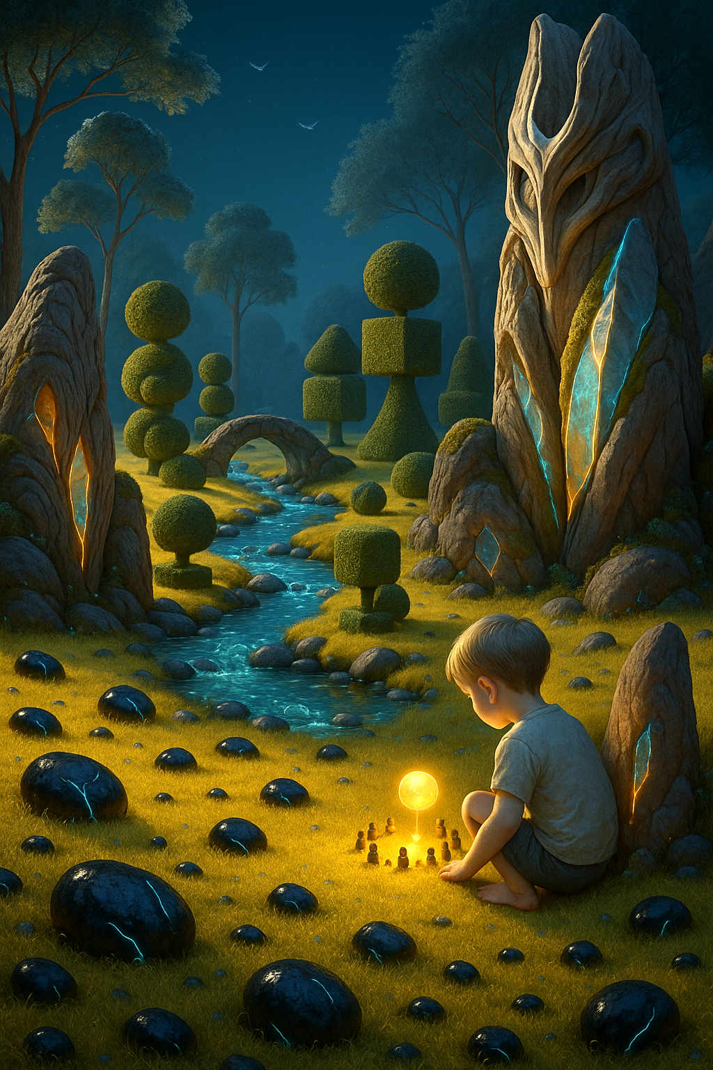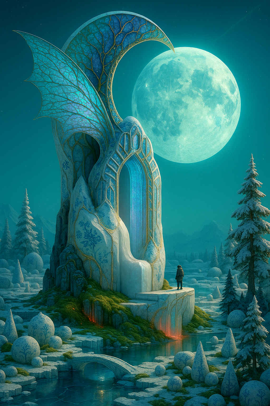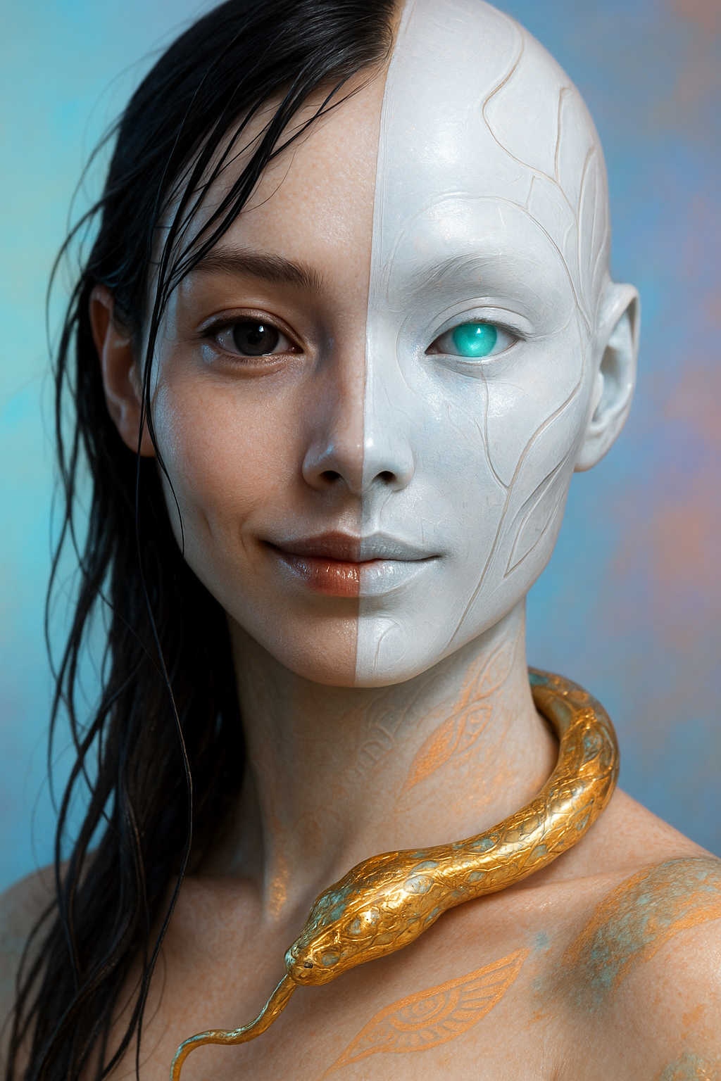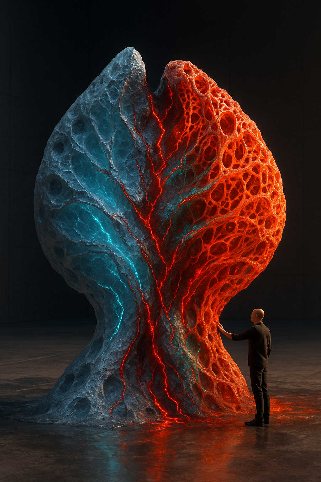 Diese Galerie zeigt eine Bildwelt, die sich jenseits bekannter Kategorien bewegt: monumentale Hybridwesen, geformt aus Stein, Wurzeln, Licht und organisch verschlungenen Strukturen. Ihre Körper wirken zugleich wie Landschaften, Skulpturen und mythische Archetypen, getragen von einer eigenen Symbolsprache aus Masken, Händen, Schachmustern und leuchtenden Energieadern. Viele der Figuren scheinen nicht gebaut, sondern gewachsen – wie Relikte einer fremden Zivilisation, die Natur und Bewusstsein miteinander verschmilzt. Die Werke formen eine kohärente Welt, in der Biologie, Mythologie und Architektur nahtlos ineinander übergehen. In ihrer Konsequenz und Wiedererkennbarkeit entfalten sie eine ungewöhnlich starke visuelle Identität: eine organische Mythopoetik, die zugleich poetisch, rätselhaft und zeitlos wirkt.
